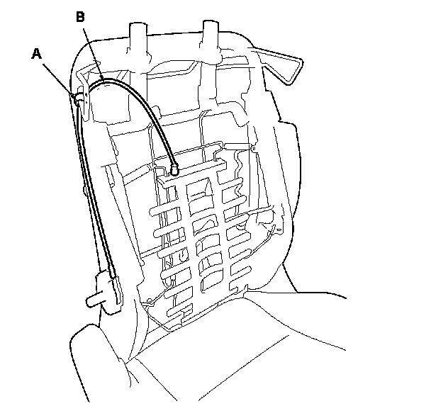 3. Remove the cable clamp (A) fastening the lumbar support cable (B).