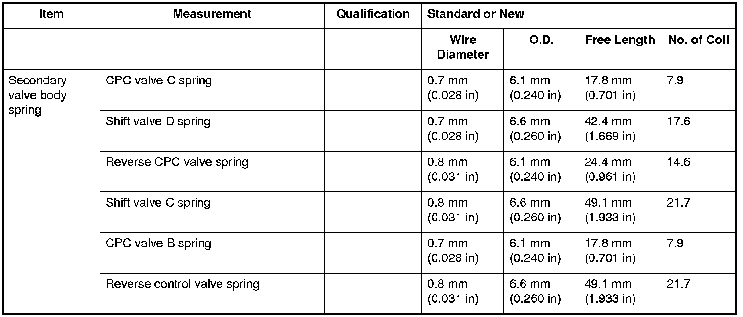 Secondary Valve Body Spring Specifications