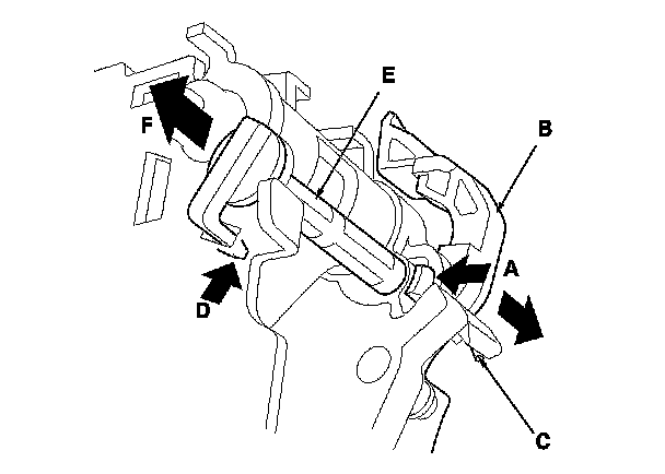 9. Make sure that the release spring end (A) is installed in the shift lock release (B), and the other end (C) of the release spring is on the stop (D).