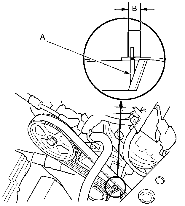 2. Check that the auto-tensioner indicator (A) is within the standard range (B) as shown. If it is out of the standard range, replace the drive belt Service and Repair.