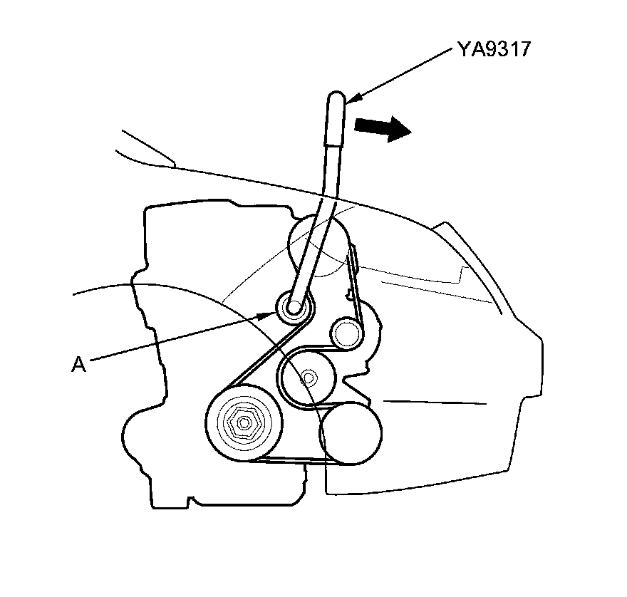 1. Move the drive belt auto-tensioner (A) using the belt tension release tool in the direction of the rotation arrow to relieve tension from the drive belt, then remove the drive belt.