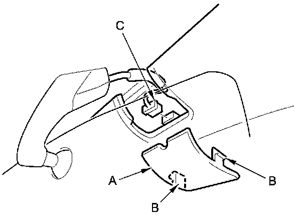 1. Carefully pry out the front cover (A) with the appropriate trim tool to release the hooks (B), and then disconnect the rearview mirror connector (C).