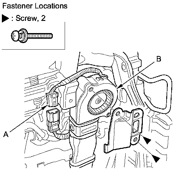 3. Disconnect the blower motor connector (A), and remove the screws, then remove the blower motor/duct (B) from the seat-back frame.