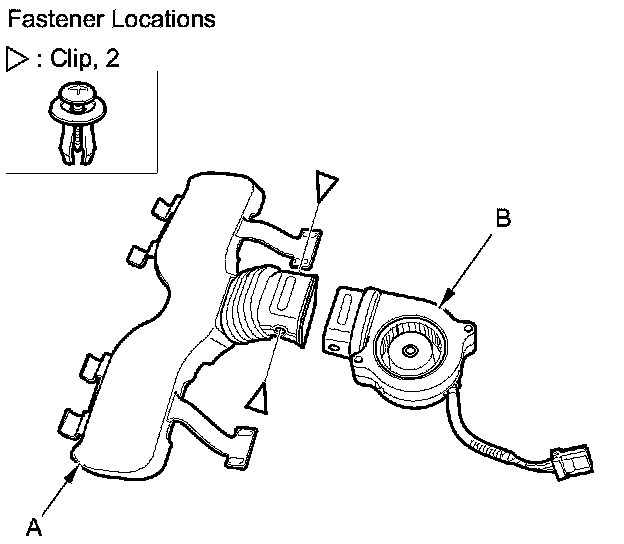 6. Remove the clips, then separate the duct (A) and the blower motor (B).