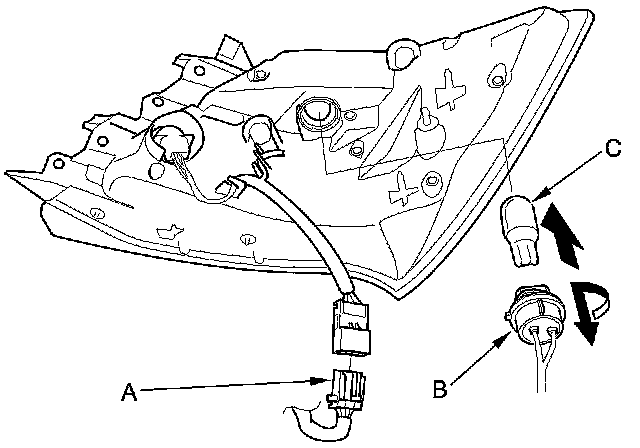 5. Turn the bulb sockets (B) 45 ° counterclockwise to remove the bulbs (C).