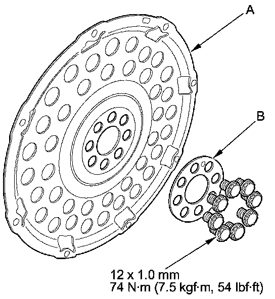 2. Remove the drive plate (A) and the washer (B) from the engine crankshaft.