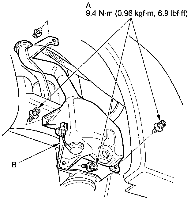 3. Remove the clip and three bolts (A), then remove the washer reservoir (B).