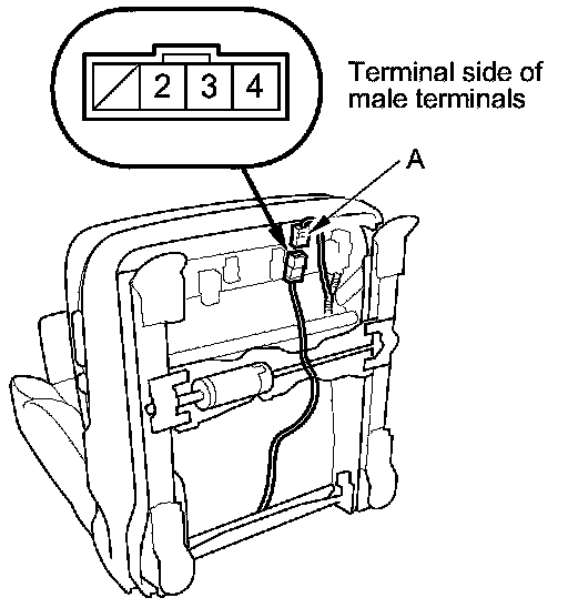 3. Check for continuity between seat heater 4P connector terminals No. 2 and No. 4 and terminals No. 3 and No. 4. There should be continuity.