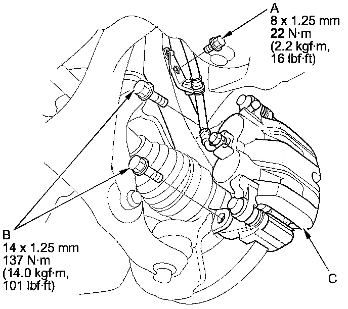 4. Remove the brake caliper bracket mounting bolts (B), then remove the caliper assembly (C) from the knuckle. To prevent damage to the caliper assembly or brake hose, use a short piece of wire to hang the caliper assembly from the undercarriage. Do not twist the brake hose excessively.