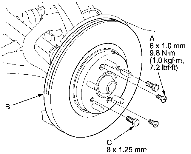 NOTE: If the brake disc is stuck to the front hub, thread two 8 x 1.25 mm bolts (C) into the brake disc to push it away from the front hub. Turn each bolt 90 degrees at a time to prevent the brake disc from binding.