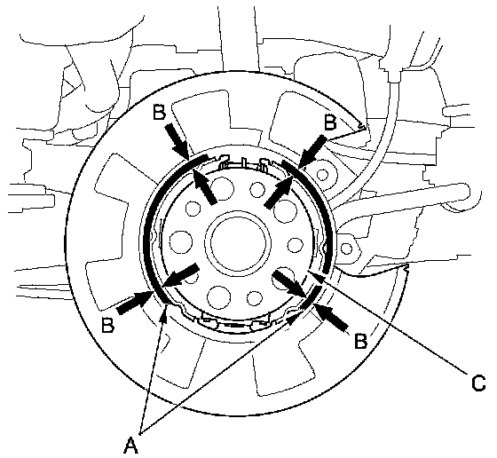 7. Check the hub (C) for smooth operation. If it requires servicing, replace the hub bearing unit.
