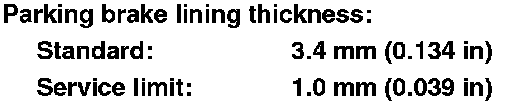 6. If any part of the parking brake lining thickness is less than the service limit, replace all the parking brake shoes as a set Removal and Replacement.