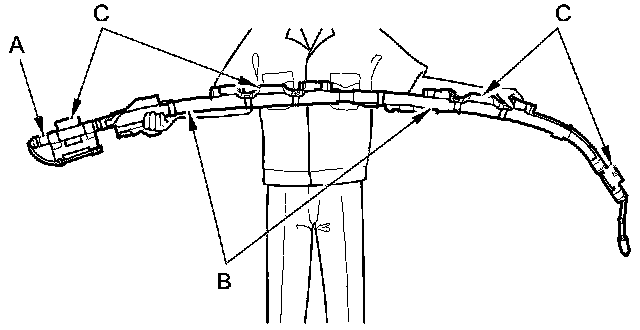 - The side curtain airbag module assembly is a long, jointed part containing an inflator (A), a flexible bag (B), and brackets (C). When removing or installing the side curtain airbag assembly, never: