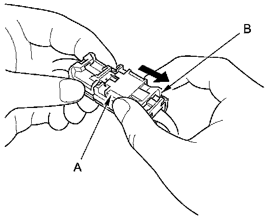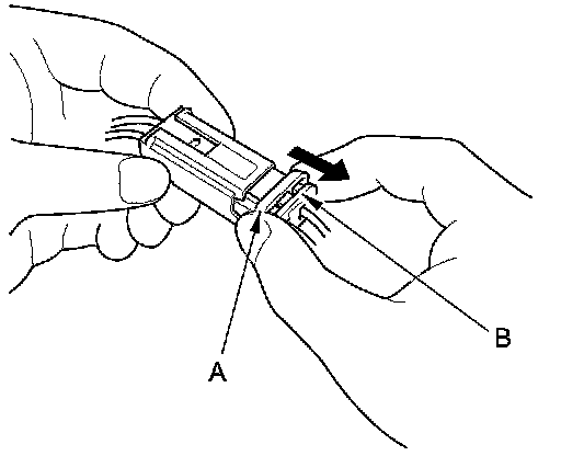 To reconnect, hold the pawl-side connector, and press on the back of the sleeve-side connector in the direction shown. As the two connector halves are pressed together, the sleeve (A) is pushed back by the pawl (B). Do not touch the sleeve.