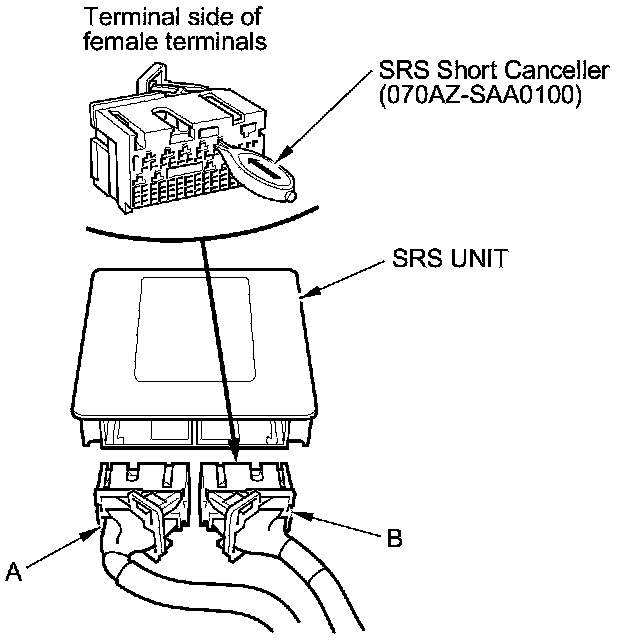 When SRS unit connectors A (39P) and B (39P) are disconnected, short circuits are automatically created in the connector to prevent accidental deployment of an airbag or tensioner. The circuit may need to be opened sometimes when diagnosing the system. Insert an SRS short canceller (070AZ-SAA0100) in the specified cavities when necessary to keep the circuit open for diagnosis.