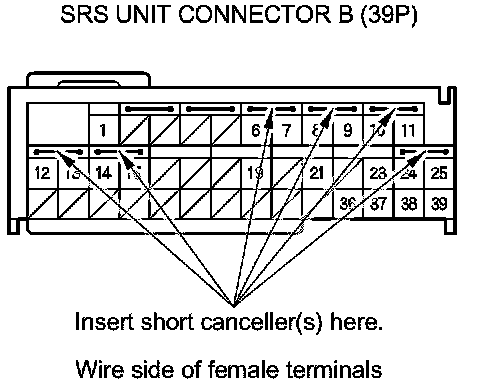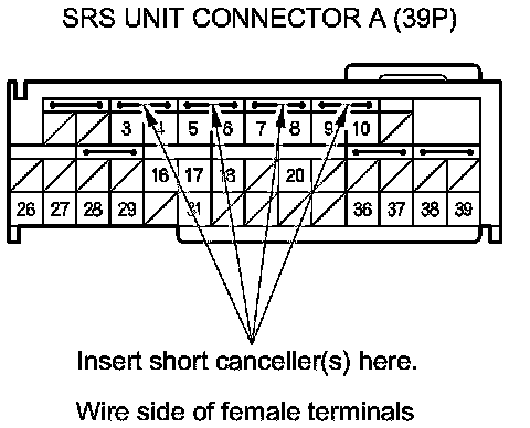 Terminal numbers are shown from the wire side of the female terminals. Insert the SRS short canceller(s) into the cavities on the terminal side of the connector.