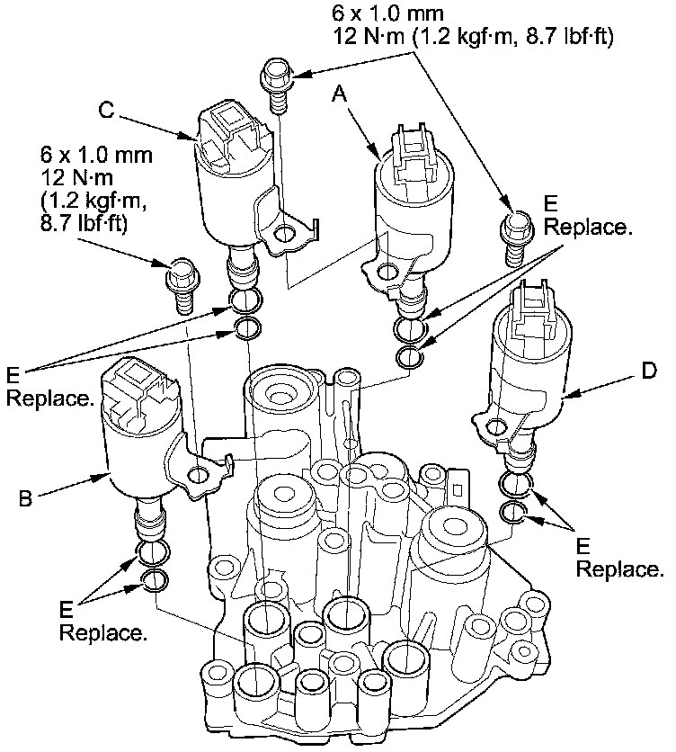 2. Install new O-rings (two O-rings per shift solenoid valve) (E) on each solenoid valves.