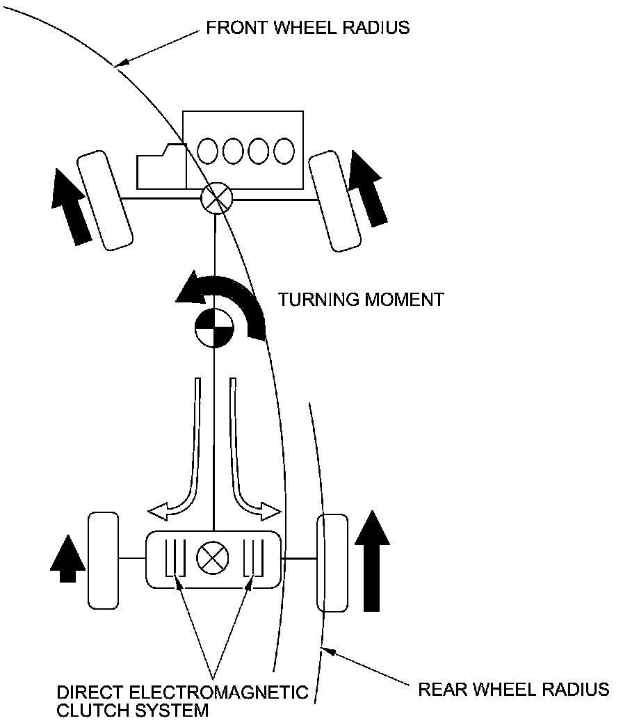 1. The direct electromagnetic clutch system consists of the coils, the planetary gear sets, and the multi-plate clutches that are installed in the side cases on either side of the differential carrier. When driving straight ahead, both rear wheels rotate at the same speed. When turning, current is applied to the appropriate outside wheel main coil to engage the clutch. The amount of current passed through the electromagnetic clutch controls the amount of driving force to the outside wheel.