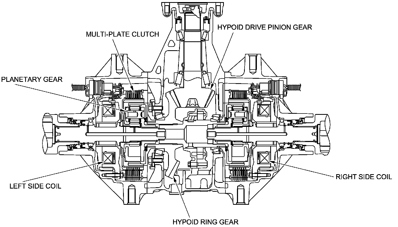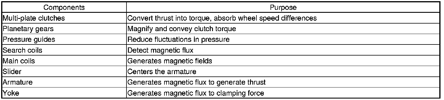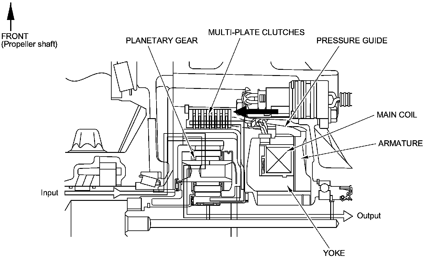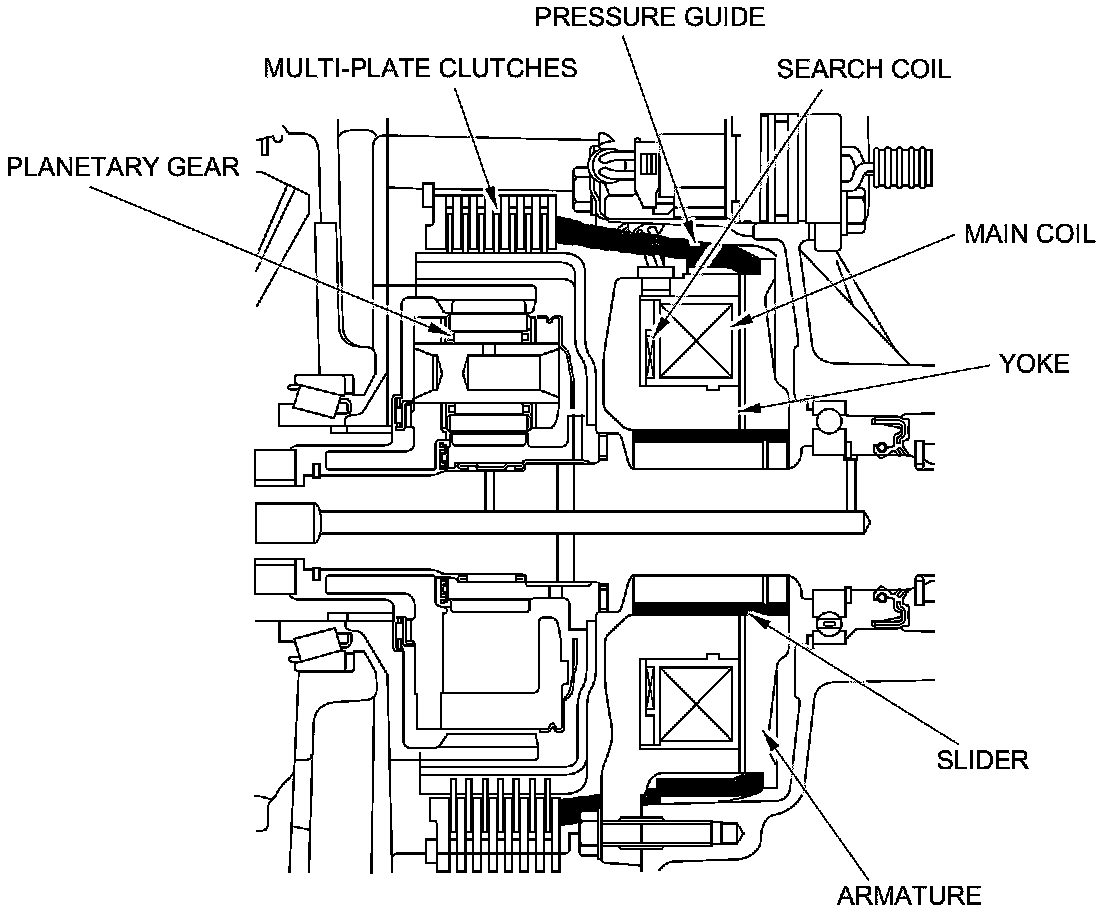 The electromagnetic clutch system is incorporated into the side case assemblies on both sides of the differential case. The system consists of the multi-plate clutches, the planetary gears, the pressure guides, the solenoid coil assembly (the search coil and the main coil), the armature assembly (the slider and the armature), and the yoke.