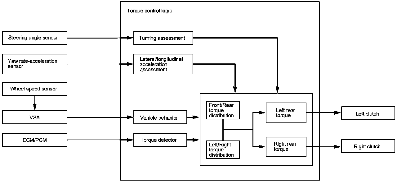 The SH-AWD control system consists of a SH-AWD control unit, the ECM/PCM, the VSA modulator-control unit, along with various sensors and switches that detect the steering angle, the lateral G force, the yaw, and the vehicle speed. A fluid temperature sensor is located on the rear differential. The control units exchange information via the CAN communication lines. The SH-AWD control unit has a self-diagnostic function. If a malfunction is detected, the SH-AWD control unit turns on the SH-AWD indicator in the gauge control module, and the system goes into fail-safe mode. When in fail-safe mode, the vehicle disables the SH-AWD differential. The vehicle defaults to front wheel drive and reduces engine torque to suit the driving conditions.