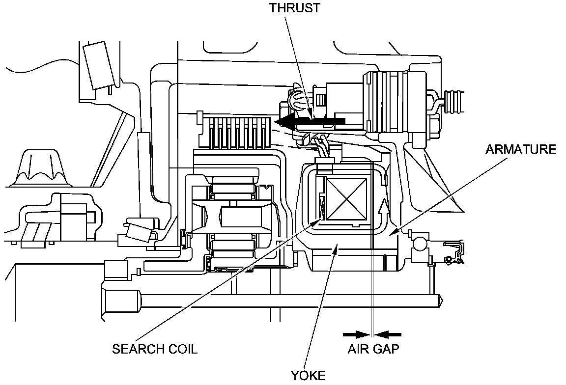 As the clutch discs wear, the air gap between the pressure guides and the multi-plate clutches decrease. The decrease in air gap changes the magnetic field generated by the main coil and the yoke. The search coil detects these changes in the magnetic field. The SH-AWD control unit uses predetermined maps to compensate for the changes to maintain precise control and smooth clutch engagement.