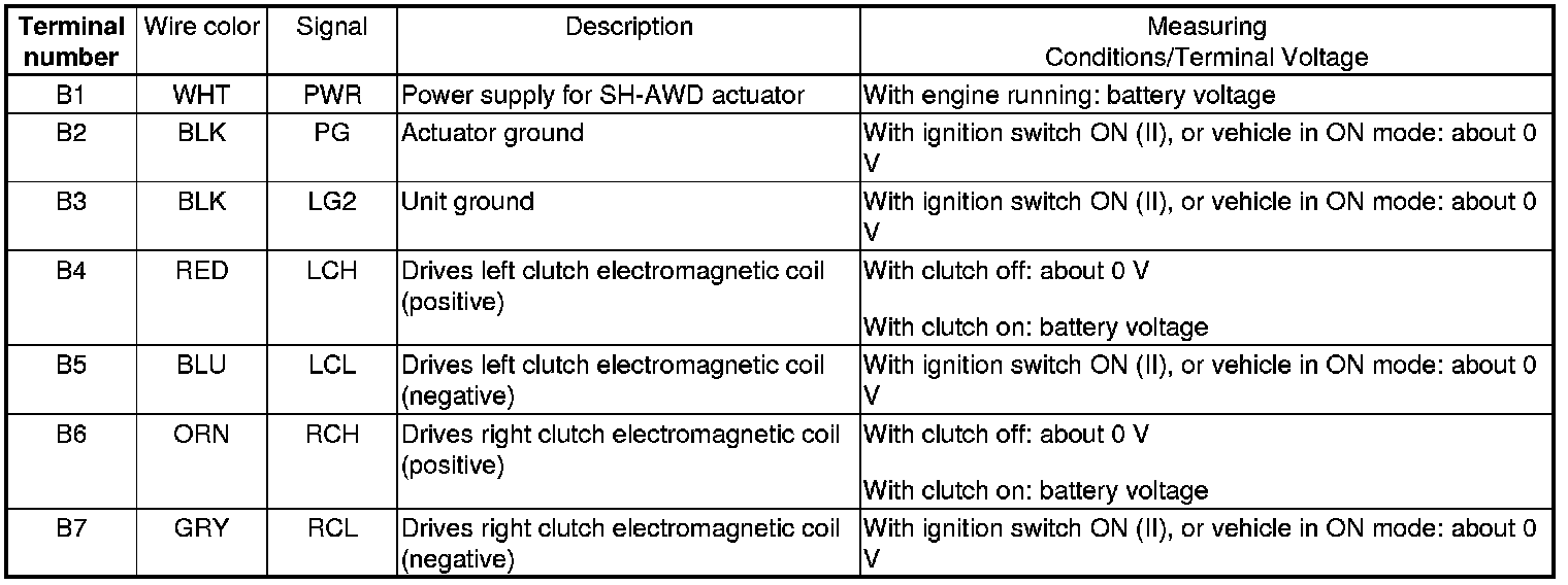 The SH-AWD control unit terminal voltages and the measuring conditions for the SH-AWD inputs and outputs test are done with the SH-AWD connectors connected.