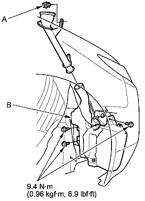 4. Remove the clip (A) and three bolts from the washer reservoir (B).