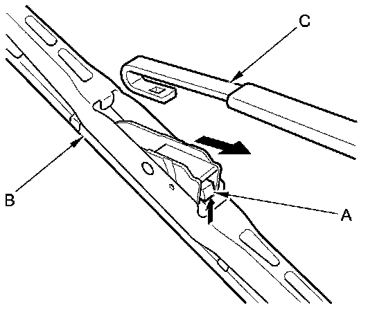 2. Press and hold the tab (A) and slide the wiper blade assembly (B) toward the tab to release it from the wiper arm (C).