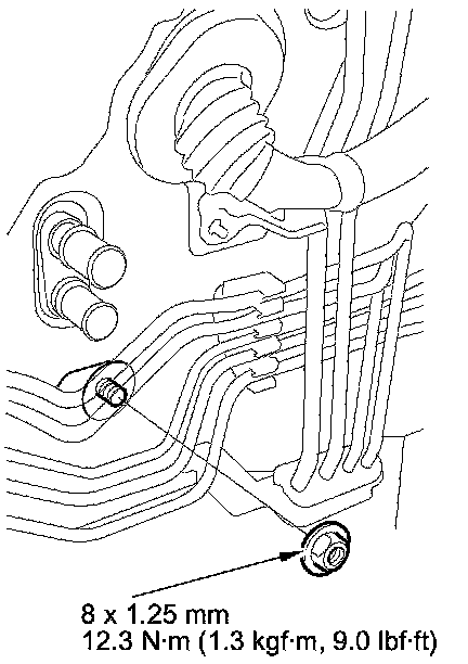 6. Remove the mounting nut from the heater unit. Take care not to damage or bend the fuel lines or the brake lines.