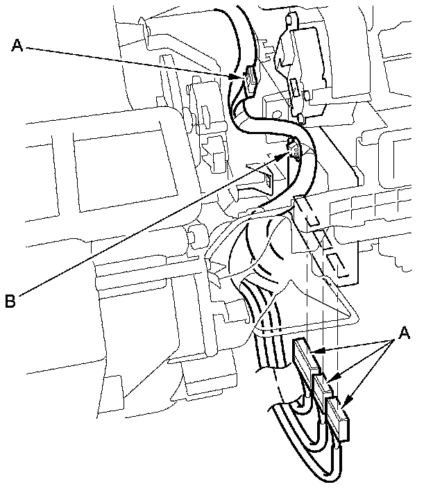 11. Disconnect these connectors (A): The recirculation control motor, and the climate control unit. Detach the harness clip (B).