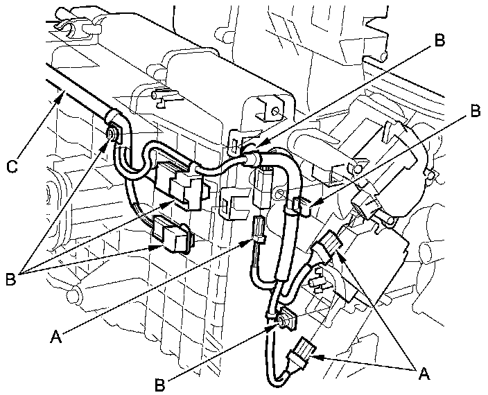 12. Disconnect these connectors (A): the driver's air mix control motor, the driver's mode control motor, and evaporator temperature sensor. Detach the harness clips (B), and remove the wire harness (C).