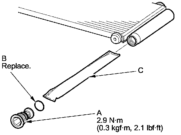 2. Remove the cap (A) from the bottom of the A/C condenser. Remove the O-ring (B) and the desiccant (C).