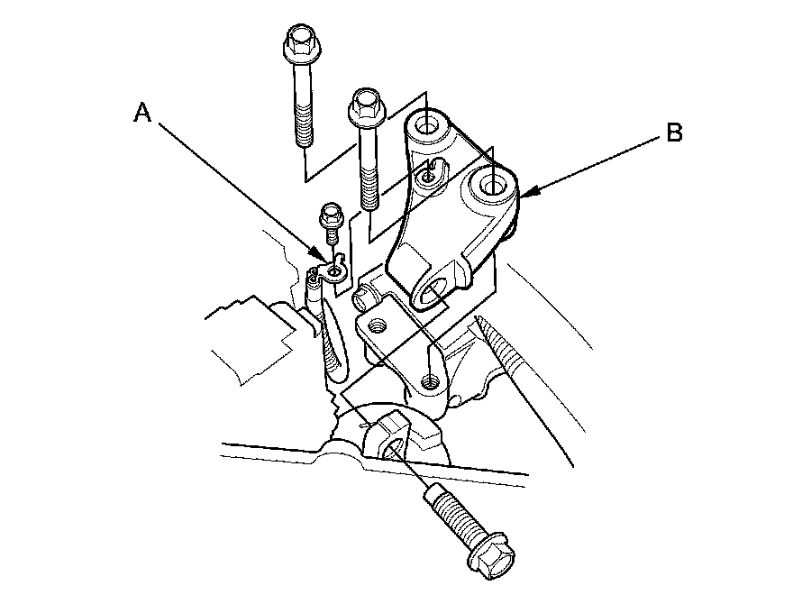 8. Remove the ground cable (A), then remove the upper half of the side engine mount bracket (B).