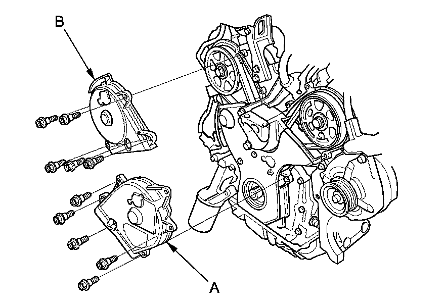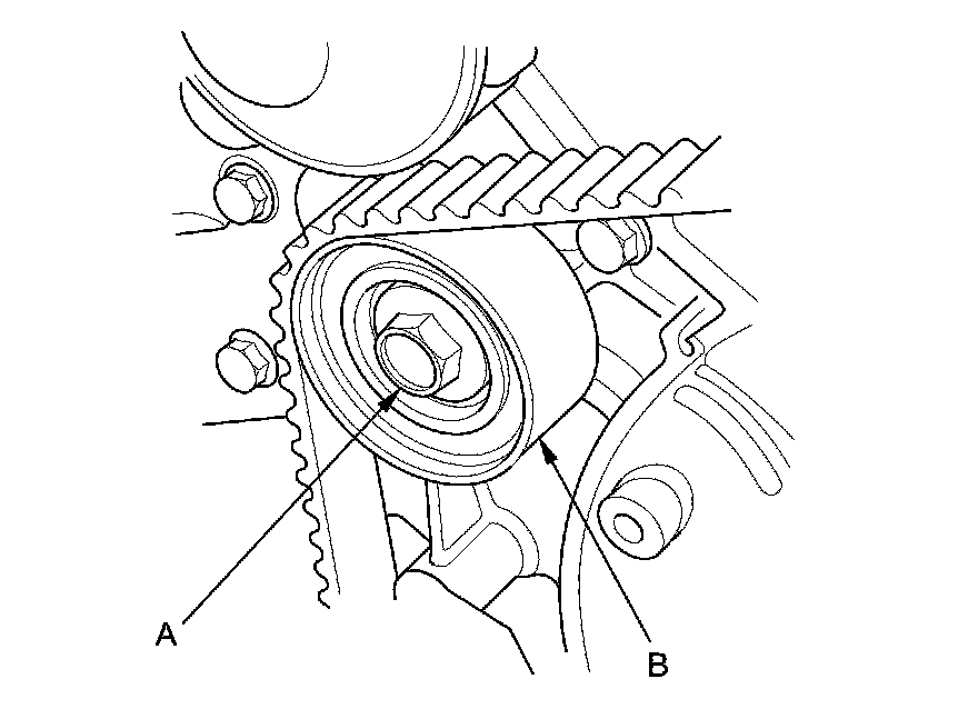 16. Remove the idler pulley bolt (A) and the idler pulley (B), then remove the timing belt. Discard the idler pulley bolt.