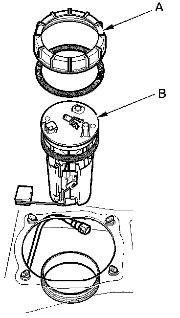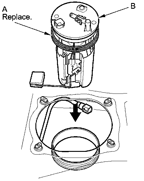 1. Temporarily attach a new base gasket (A) to the fuel tank unit (B), then insert the fuel tank unit partially into the fuel tank.