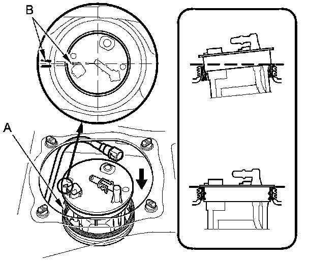3. Align the marks (B) on the fuel tank and fuel tank unit, then insert the fuel tank unit into the fuel tank until the fuel tank unit rests on top of the base gasket.