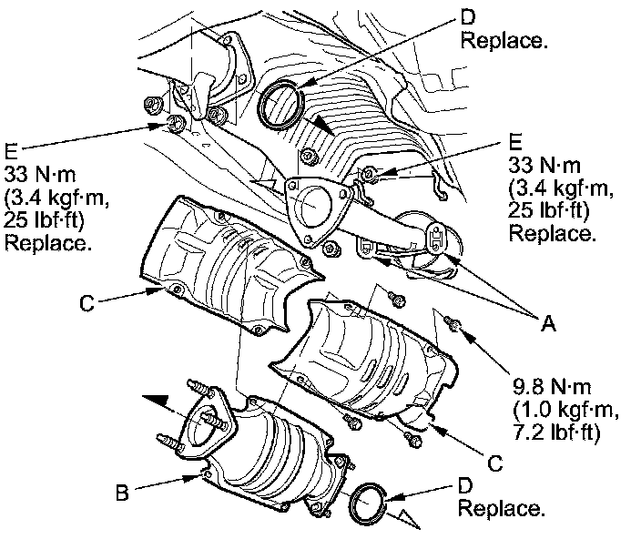 5. Install the parts in the reverse order of removal with new gaskets (D) and new self-locking nuts (E).