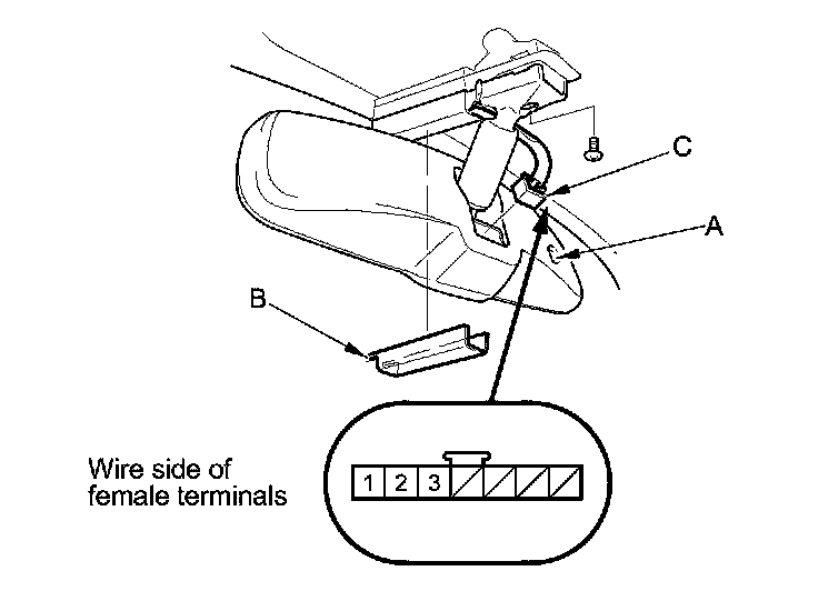 2. Remove the cover (B), then disconnect automatic dimming inside mirror 7P connector (C).