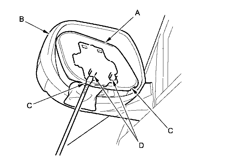 3. Apply heat with a heat gun to the gap between the mirror holder (A) and the mirror housing (B). Carefully pull out the bottom edge of the mirror holder to separate the adhesive (C), and then release the side hooks (D).