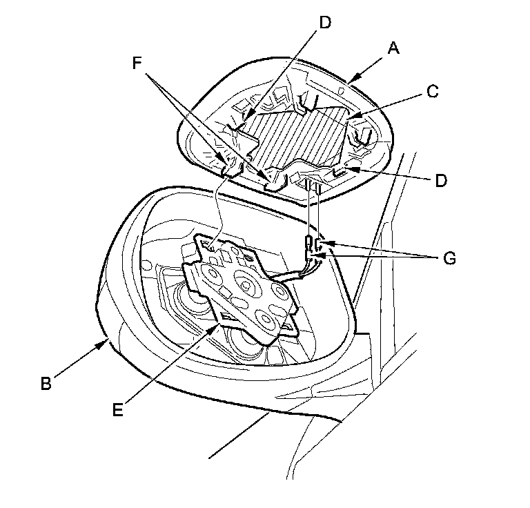 4. Separate the mirror holder from the actuator (E) by releasing the hooks (F), and disconnect the mirror defogger connectors (G).