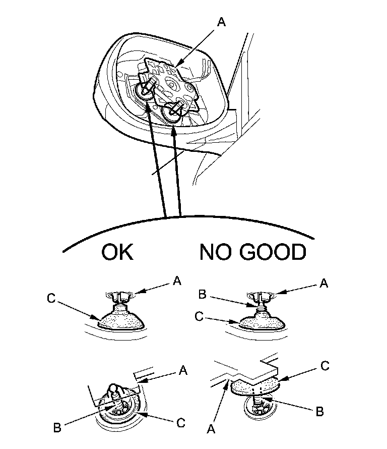 5. Before reinstalling the mirror holder to the actuator (A), check the actuator rods (B) and the actuator boots (C).