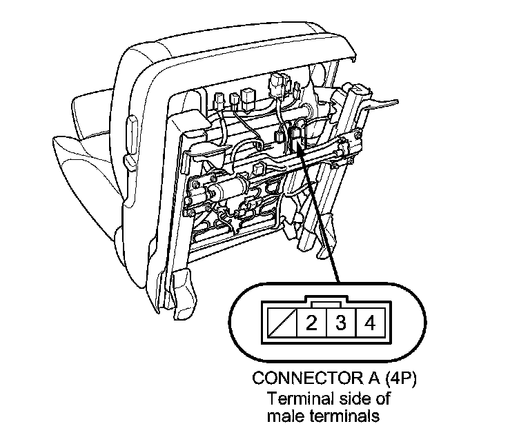 8. Check for continuity between seat heater connector A (4P) terminals No. 2 and No. 3, and terminals No. 3 and No. 4. There should be continuity.