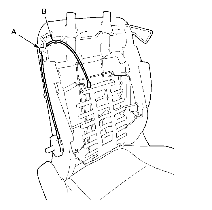 3. Remove the cable clamp (A) fastening the lumbar support cable (B).