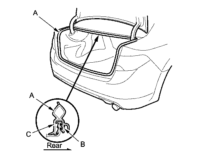 1. Remove the trunk lid weatherstrip (A) by pulling it off.