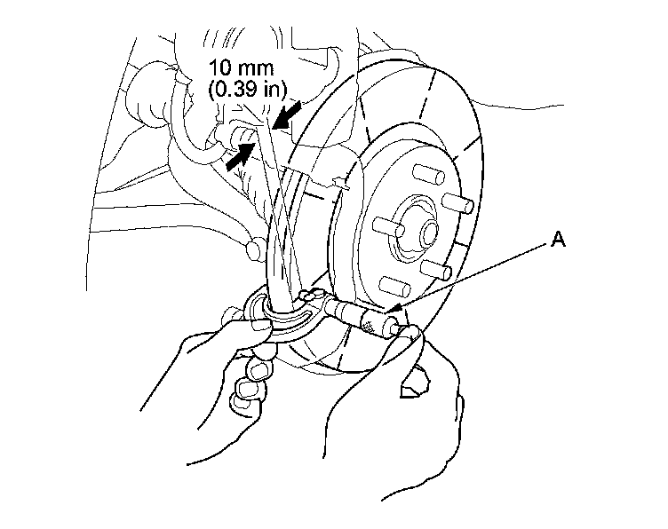6. Set up the dial gauge (C) against the brake disc as shown, and measure the runout at 10 mm (0.39 in) from the outer edge of the brake disc.