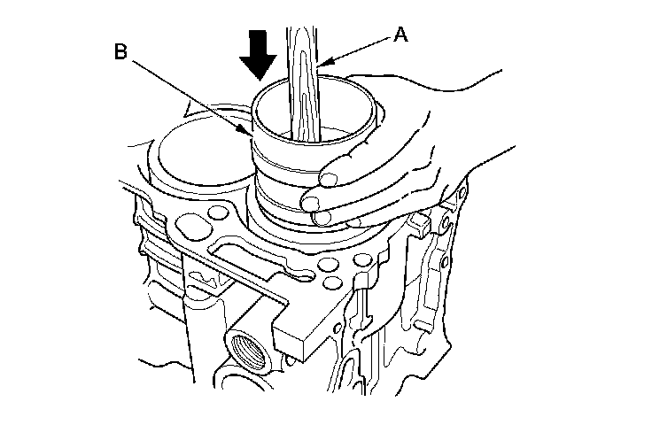 Push down on the ring compressor (B) to prevent the rings from expanding before entering the cylinder bore.