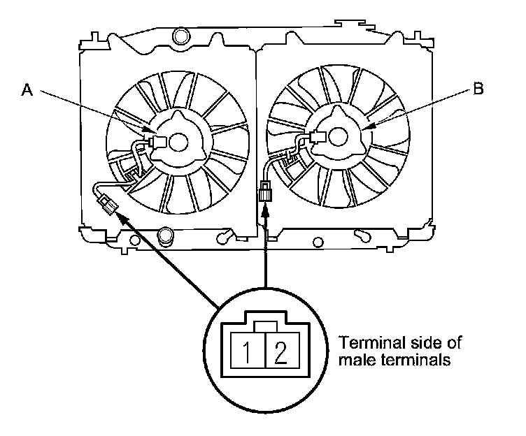 1. Disconnect the 2P connectors from the radiator fan motor (A) and the A/C condenser fan motor (B).