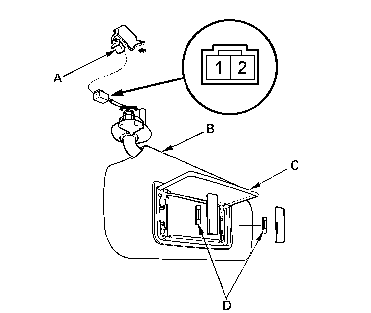 4. If the continuity is not as specified, check the bulbs (D). If the bulbs are OK, replace the sunvisor Service and Repair.