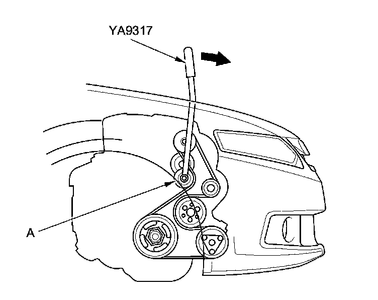 1. Move the auto-tensioner (A) using the belt tension release tool in the direction of the arrow to relieve tension from the drive belt, then remove the drive belt.