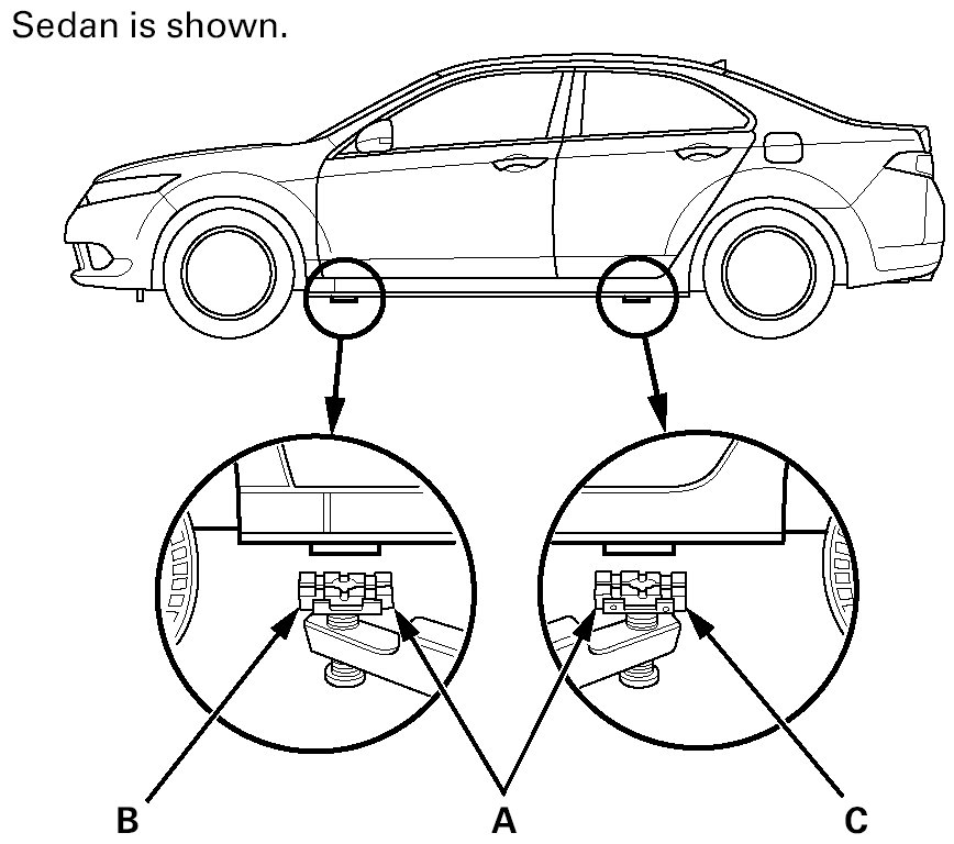 1. Position the lift pads (A) under the vehicle's front support points (B) and rear support points (C).